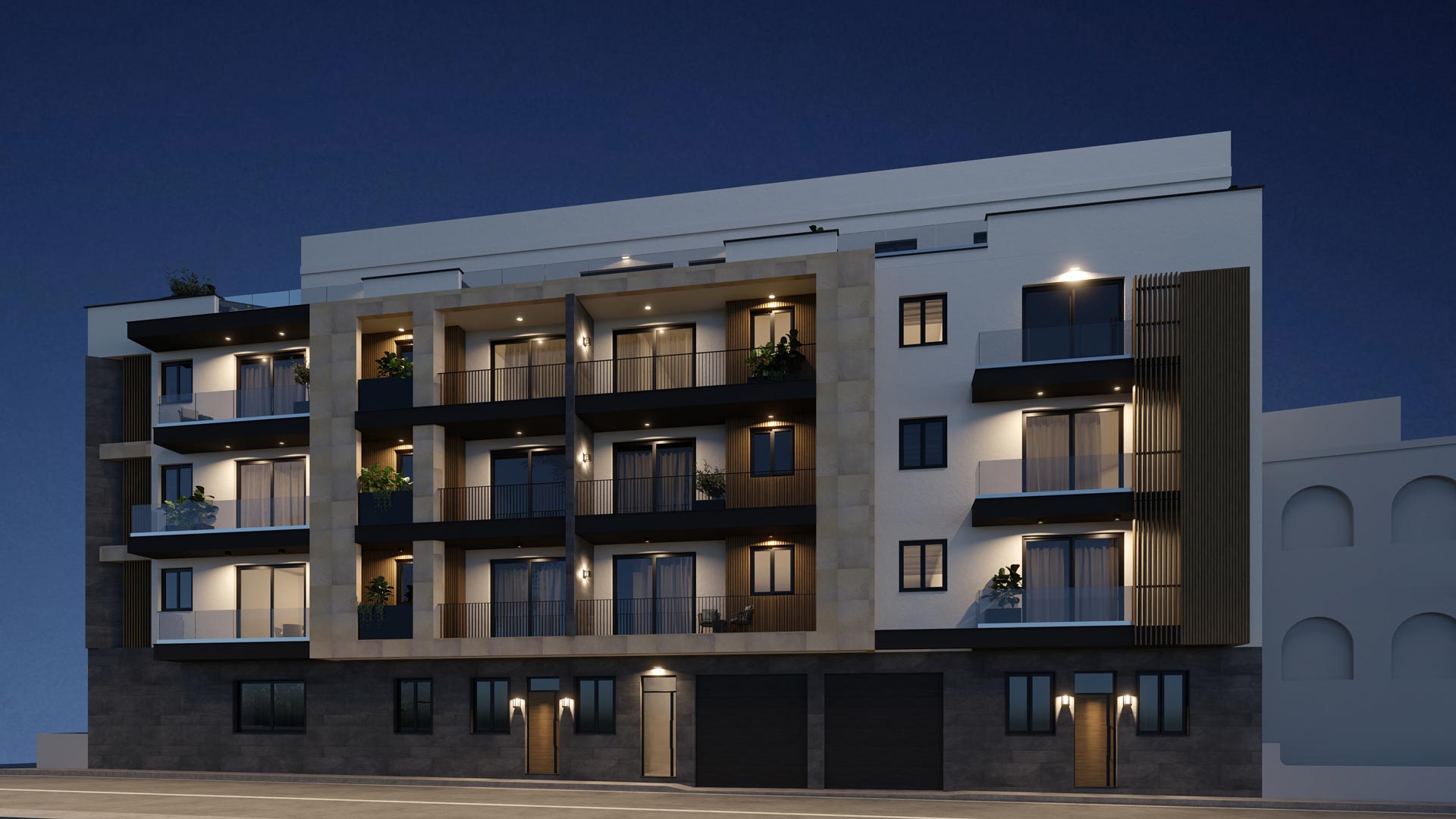 This development consists of 12 units: 2 maisonettes, 9 apartments, and 1 penthouse. Layouts are in the form of an open plan kitchen/living/dining rooms, 2 double bedrooms of which the main bedroom has an en-suite showert, main bathroom, and 1 terraces. This development is being offered fully finished according to our finishing list and to customers' specifications. Apart from the basic finishes of water & electricity, we are finishing our properties with UPVC double glazed apertures for each door and window together with insect screens, sound insulation between each floor,thermal insulation on façade, all tiling with skirting, 2 complete bathrooms, 4 energy-efficient AC units installed, solid internal doors, and a mechanical ventilation system. The complete list of finishes can also be downloaded from our website. Optional garages are also available.